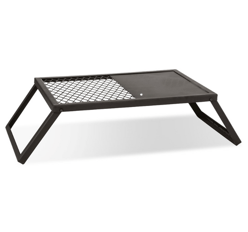 Heavy-duty 2mm steel construction with enamel finish. Foldable legs for easy storage. Surface brushes clean. Griddle side includes a drainage hole....