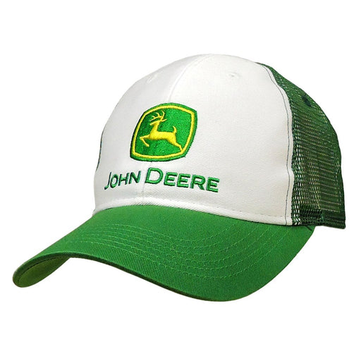 Featuring a white front and green mesh back, this cap showcases the original JOHN DEERE logo and green wording. The front is made of 100% cotton wh...